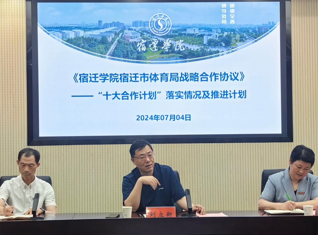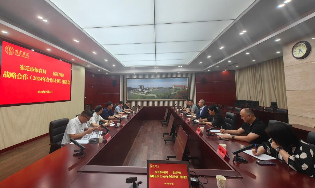 为推动与宿迁市体育局合作走深走实,7月4日下午,体育学院在图书馆视频会议室召开战略合作推进会,校党委常委、纪委书记刘立新,市体育局局长陈恒、副局长王艳、祁全,市体育运动中心主任王北江,市体育运动学校校长李云开,市体育总会副秘书长魏昕等参加会议。会议由体育学院副院长(主持工作)于华主持。