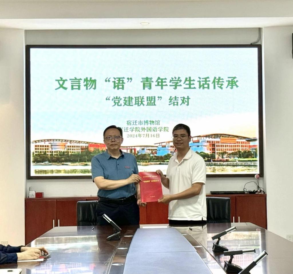 为深入学习贯彻习近平新时代中国特色社会主义思想,充分发挥党建共建在馆校合作中的引领作用,推动博物馆资源与高校教育资源共享,7月16日上午,外国语学院党委书记管志强一行赴宿迁市博物馆签署党建共建协议。院长王纯磊,院党委副书记王倩,党委委员、教师第一党支部书记詹慧芳,宿迁市博物馆馆长高小亮、办公室主任刘伟等负责同志参加活动。