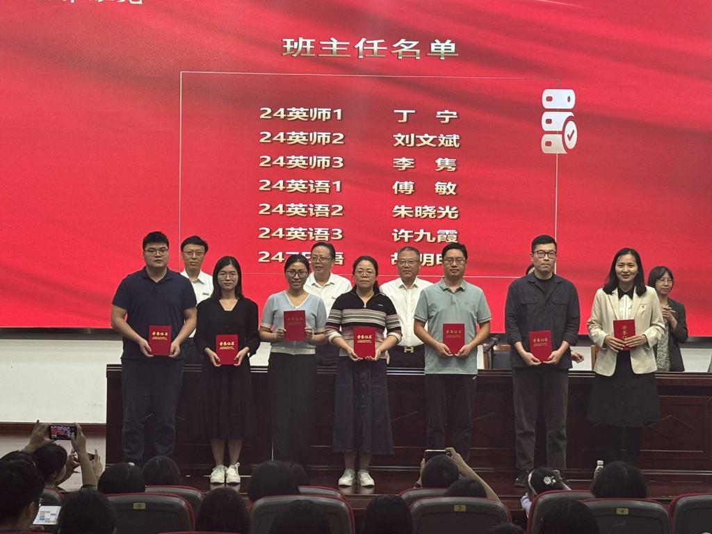 会上,学院表彰了新生军训标兵和先进个人;宣读了2024级班主任、宿舍导师、辅导员助理的聘任文件;各系主任、专业带头人、班主任用专业的语言发出深情寄语;班主任代表丁宁老师发言,为新生的专业学习送上建议;2019级英师3班吴翔、21英师3班凌霄、24英语3班盛爱乔分别代表校友、老生和新生进行发言。