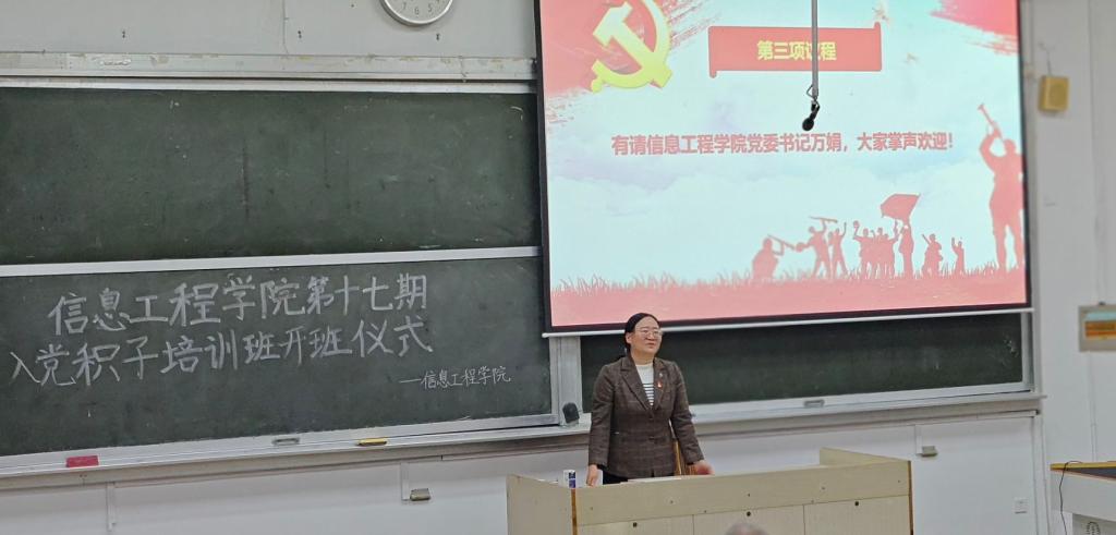 为提高入党积极分子的理论水平与思想修养,进一步端正入党动机,信息工程学院10月21日晚举办第十七期入党积极分子培训班。信工院党委书记万娟、办公室主任曹志成、培训班全体学员参加活动。