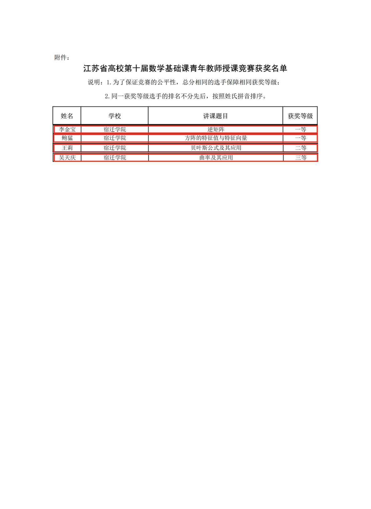 日前,在省教育厅高等教育处指导下,由省高等学校数学教学研究会主办、苏州城市学院承办的江苏省高校第十届数学基础课青年教师授课竞赛结束,我校数理学院4名参赛教师取得优异成绩。李金宝教授的《逆矩阵》和鲍猛博士的《方阵的特征值和特征向量》荣获一等奖。王莉博士的《贝叶斯公式及其应用》荣获二等奖,吴天庆博士的《曲率及其应用》荣获三等奖。