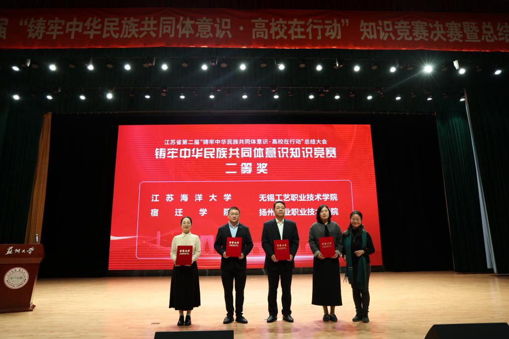 11月6日,江苏省第二届“铸牢中华民族共同体意识·高校在行动”知识竞赛决赛暨总结大会在苏州大学举行,我校代表队荣获二等奖。