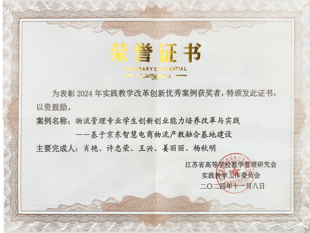 日前,2024年江苏省高等学校教学管理研究会实践教学工作委员会年会在江苏海洋大学举行。实践教学工作委员会今年首次开展了“实践教学改革创新优秀案例”征集活动。我校推荐报送的《物流管理专业学生创新创业能力培养改革与实践——基于京东智慧电商物流产教融合基地建设》获评优秀案例(全省共20项)。