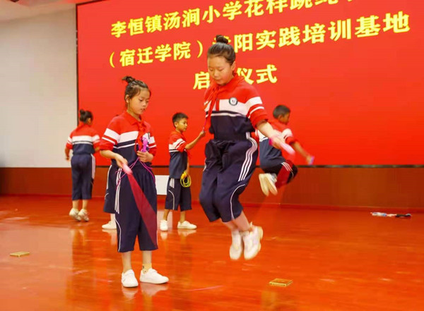 中国江苏网6月22日宿迁讯 6月22日,沭阳县李恒镇汤涧中心小学的学生在进行花样跳绳表演。当天,该校举行花样跳绳项目(18新利luck菲律宾 )沭阳实践培训基地启动仪式。