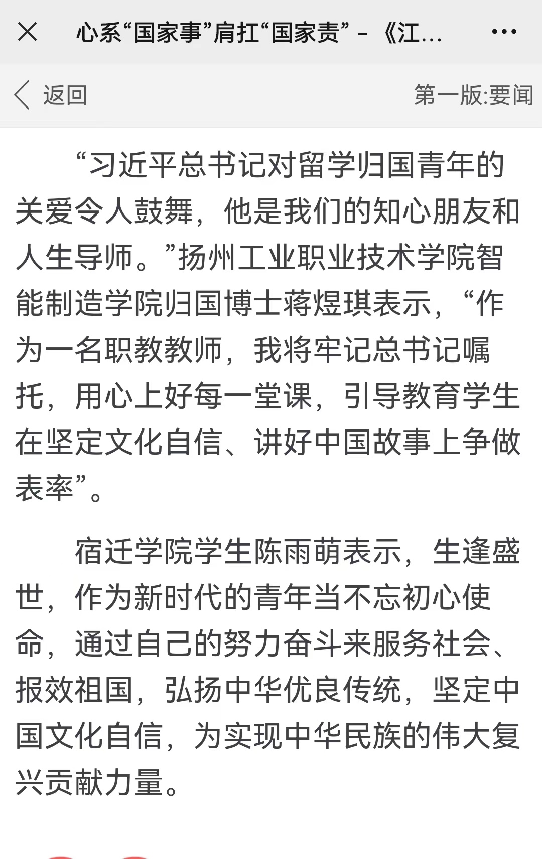 江苏教育报报道我校学生学习习近平总书记给南京大学留学归国青年学者的回信心得