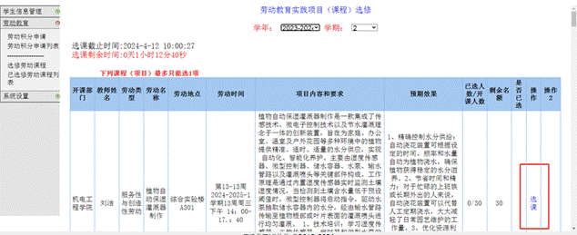 (2)在选课截止时间前,初次选课,界面如下图所示,界面中列举了当前可选课程劳动名称、地点、时间、内容和要求、预期效果、剩余名额、是否已选等字段。如下图所示。