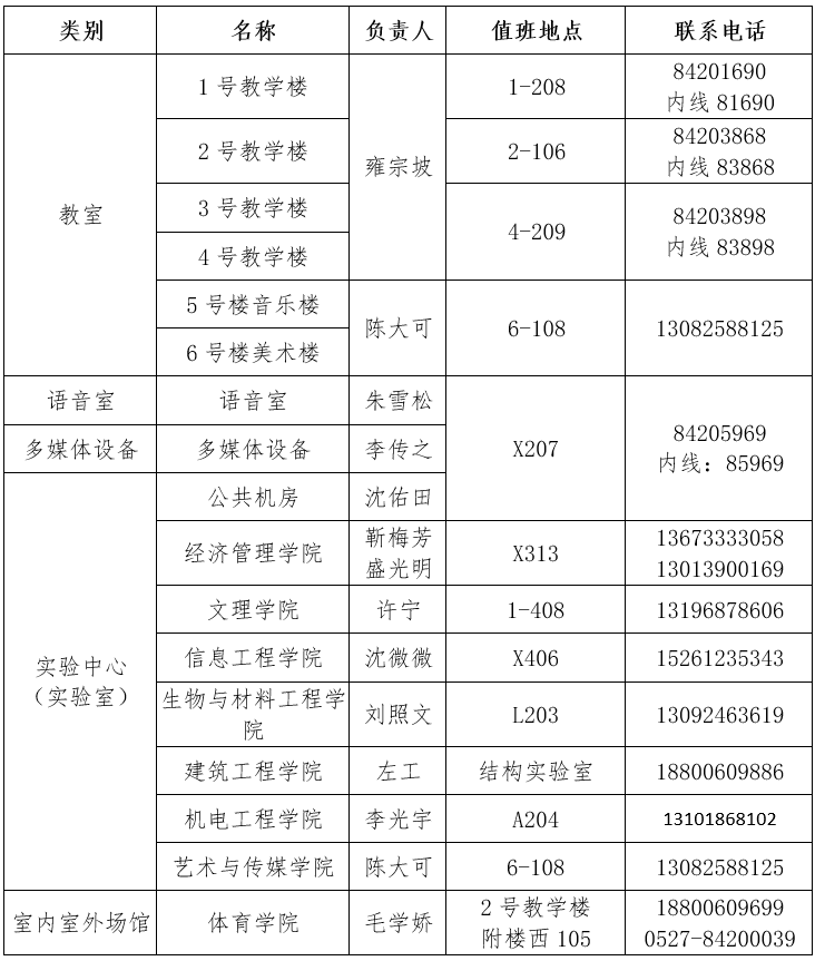 (四)在多媒体教室、语音室、实验室上课的教师,应至少提前一天至相关教室或实验室查看软硬件环境是否满足上课要求,检查有关设备的运行情况,如发现问题,及时与相关管理人员联系解决。校内教学场所负责人联系方式如下表所示: