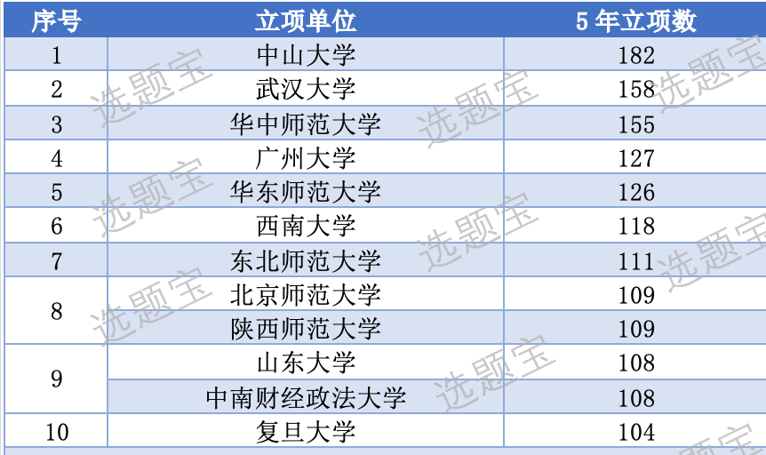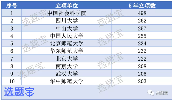 中国社会科学院遥遥领先,无需多言。高等院校里排名靠前的大多是老牌社科强校,在这个榜单之外,第11位是云南大学,5年共立项202项,非常抢眼,也是高校TOP10当中唯一一所非985院校。