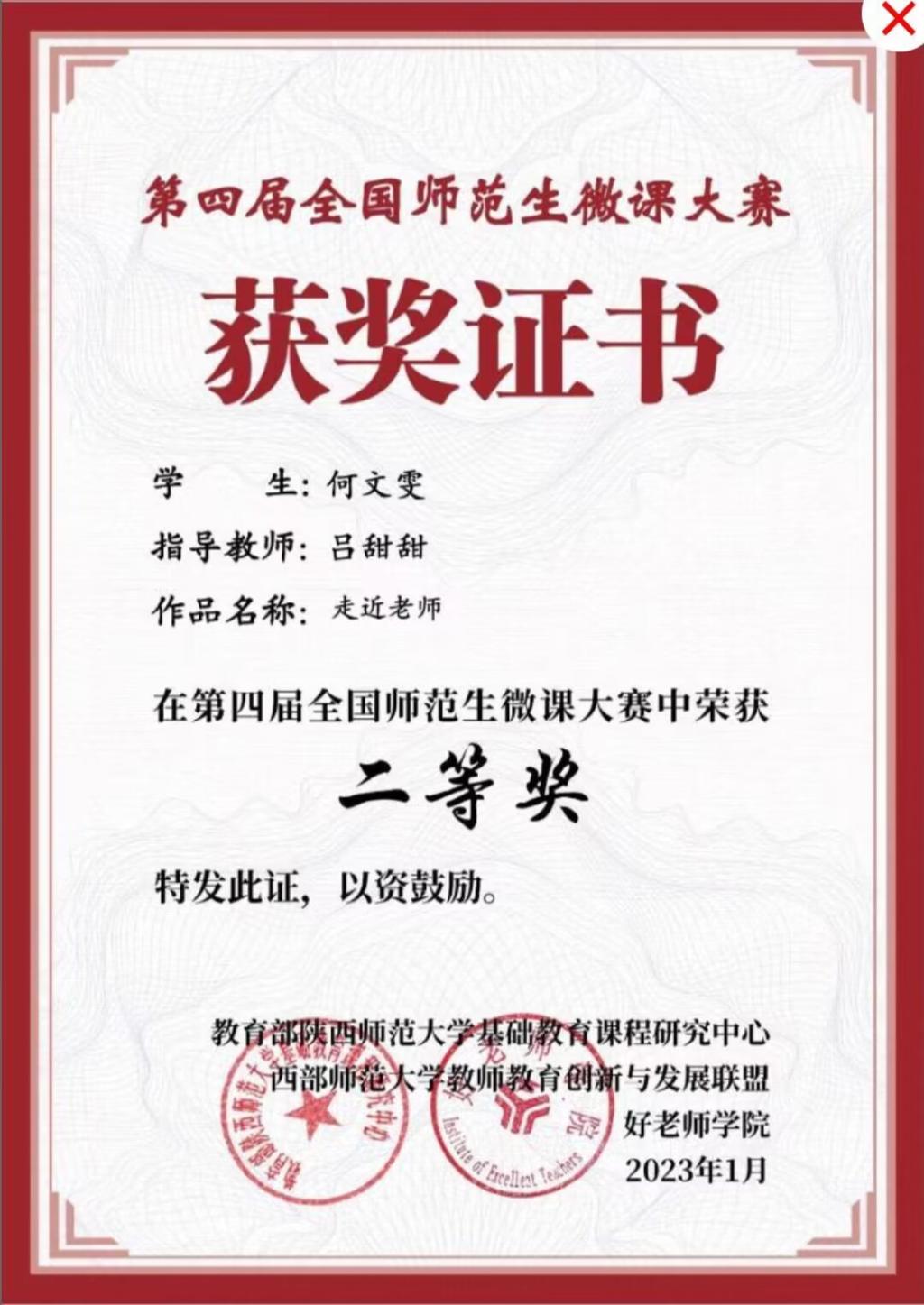 近日,由教育部陕西师范大学基础教育课程研究中心和西部师范大学教师教育创新与发展联盟主办的第四届全国师范生微课大赛获奖名单揭晓,马克思主义学院报送的4件参赛作品中有2件作品取得佳绩。其中,李明月同学的《让友谊之树常青》荣获一等奖,何文雯同学的《走进老师》荣获二等奖。