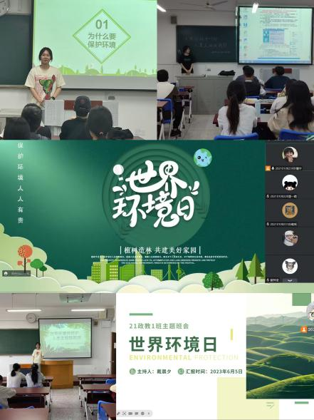 主题班会宣理念。马院各班级积极开展“世界环境日”主题班会,在班级内部宣传人与自然和谐共生理念,同时呼吁学生们从点滴做起,积极参与生态保护的实践,充实自我,善待自然。