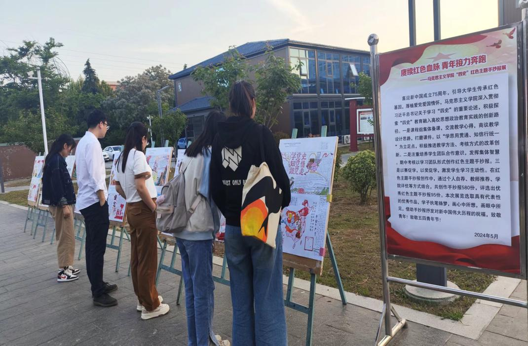 课程组全体教师组织22级大学生以团队形式创作,以“赓续红色血脉 青年接力奔跑”为主题的“四史”红色手抄报。学生团队共创作出580份手抄报。通过个人自荐、教师推荐、学院评优,共评选出95份优秀手抄报,五一期间在办公楼广场展出。本次展览吸引了教师与大学生前来观看与研讨。
