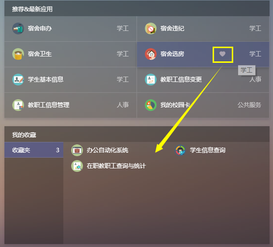 可点击应用前面的“心”标记,对常用应用进行收藏,收藏的应用会出现在“我的收藏”卡片中,方便您快捷使用。