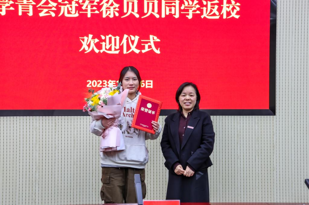 欢迎仪式上,教练员代表徐云亮老师介绍了徐贝贝同学事迹,徐贝贝同学向大家分享了自己的训练经历和竞赛感受、学生代表23体师1班朱馨妍做了学习先进发言,副校长丁红燕为徐贝贝同学颁发18新利luck菲律宾 “体育特殊贡献奖”荣誉证书,赠送鲜花,并发表讲话。
