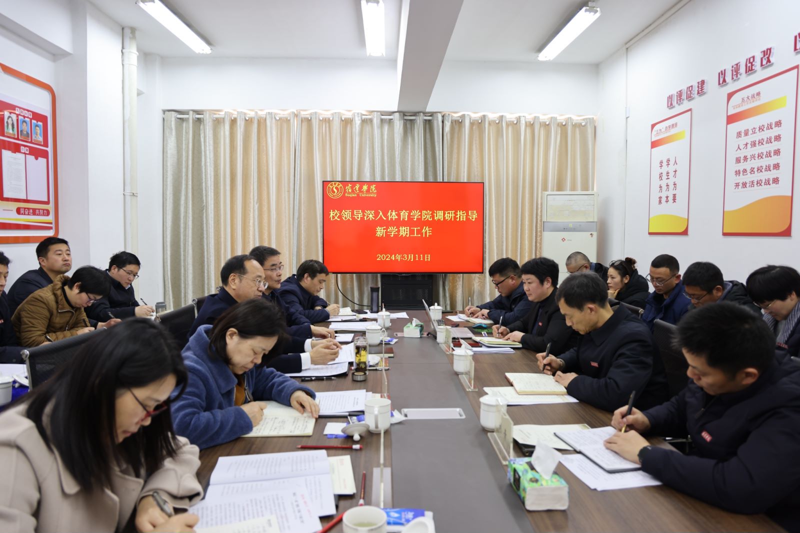 3月11日上午,校党委书记徐德、校长潘志明一行深入体育学院调研指导新学期工作。校党委常委、副校长丁红燕,校党委常委、副校长郭照冰,校党委常委、统战部部长、教务处处长陆海霞,党校办、发展规划处、人事处、教务处、科技处、学工处、研究生处、团委、继续教育处等职能部门负责人陪同调研。会议由副校长郭照冰主持。