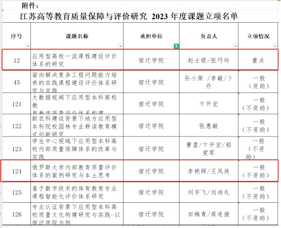 日前,根据《关于组织申报江苏高等教育质量保障与评价研究2023年度课题的通知》文件精神,经个人申报,学校推荐,经江苏省高等教育学会评估委员会组织专家评审,我院2项课题获批立项(其中,重点资助课题1项,一般课题1项)。