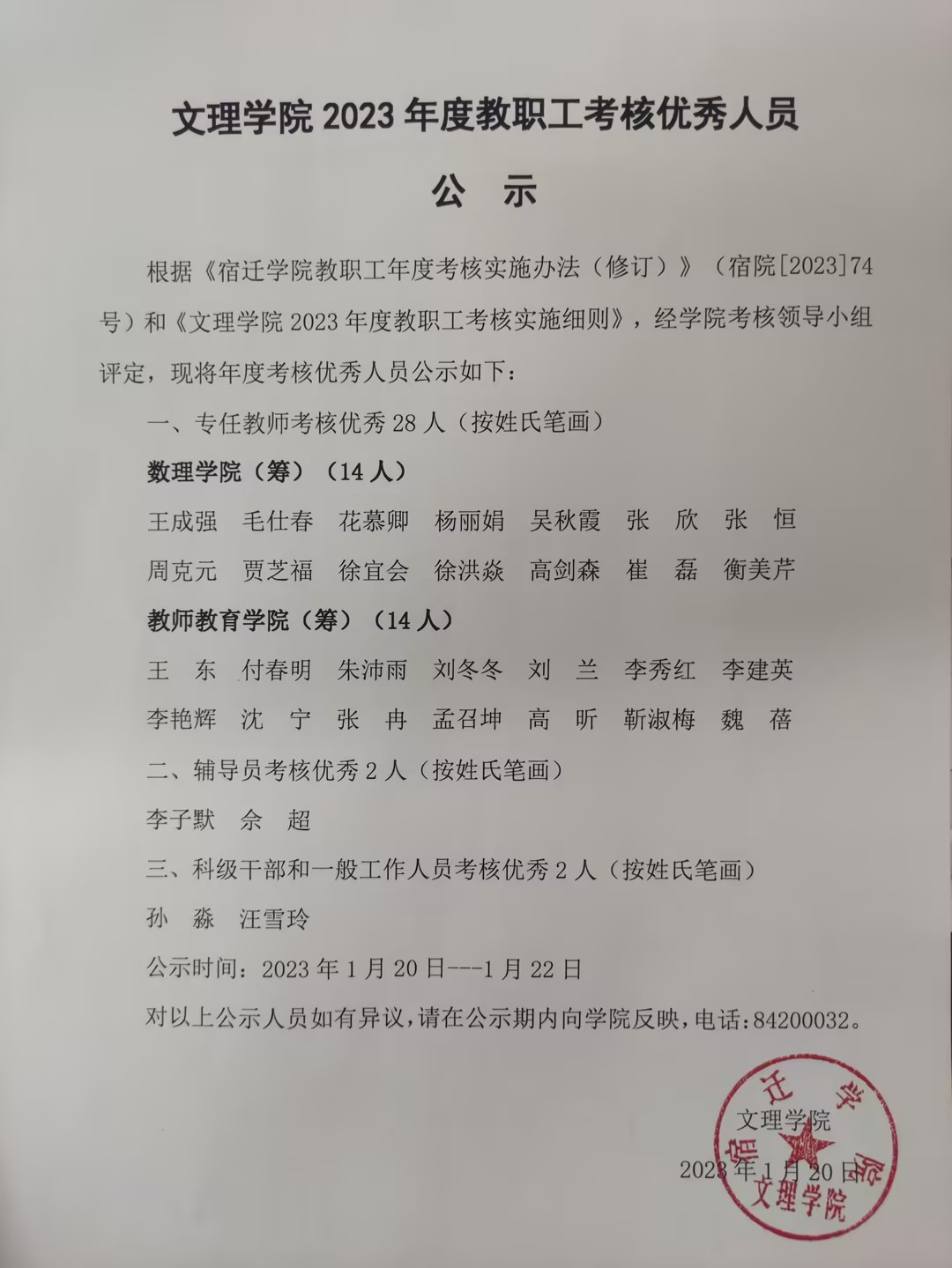 文理学院2023年度教职工考核优秀人员公示