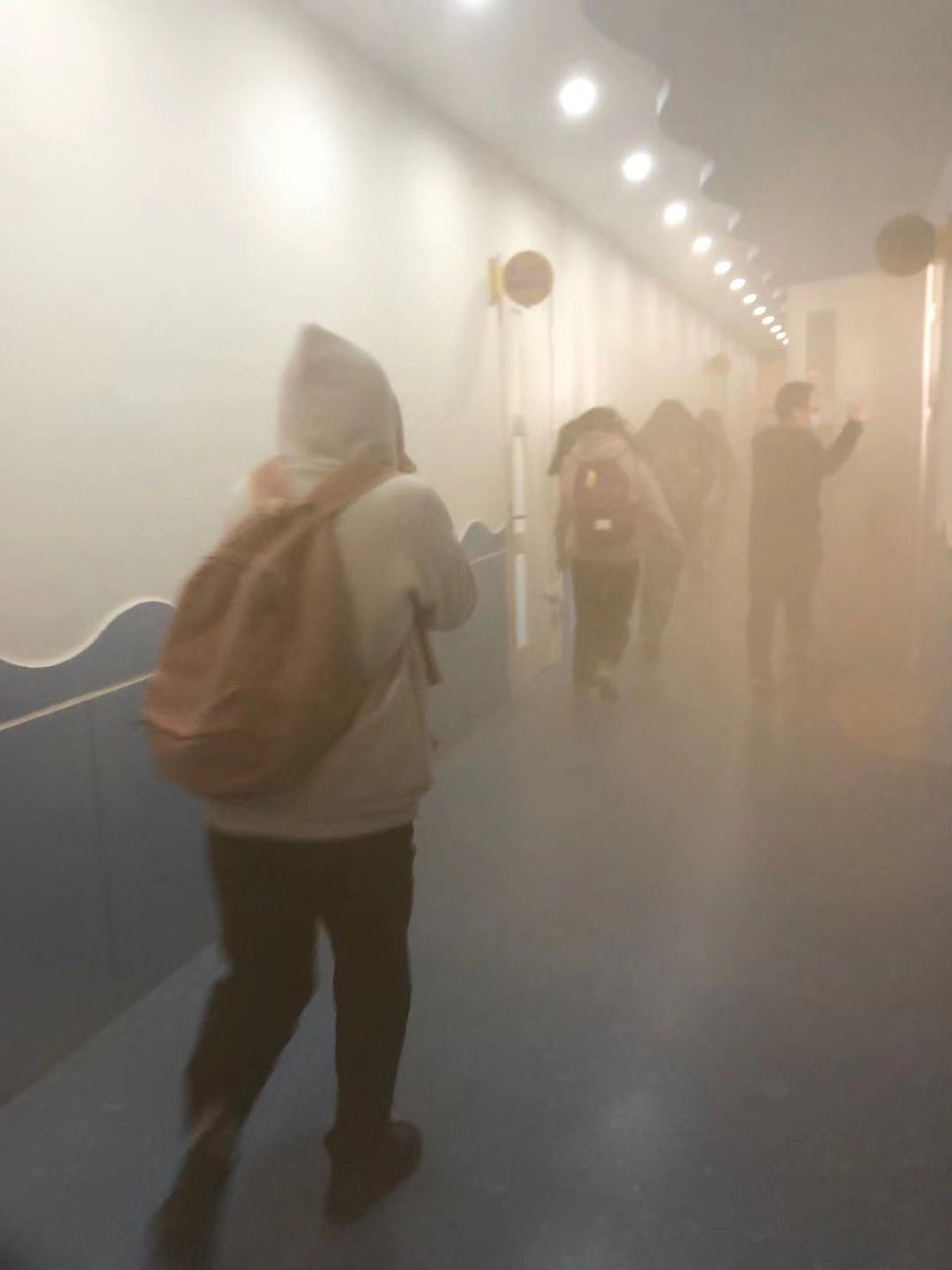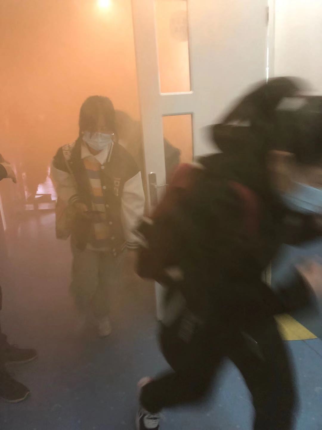 此次演练最大程度上模拟了真实场景。首先,演练前实训中心制定了详尽的演练计划,并通过公告告知师生时间地点,以免发生恐慌或报警。其次选择上午实训室课务最为集中,师生密度最大的时间节点,且演练在课间进行,对实际教学的影响降到了最低。演练中施放了无毒无害的橙色模拟烟雾,但烟雾含硫磺等刺激性气味,演练中给每一位参演师生均发放了口罩,在给予参演师生最大程度上的真实体验的同时,保护了师生身体健康。
