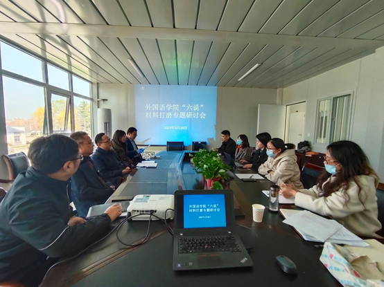 3月28日下午,外语学院举办“六说”材料打磨专题研讨会。会议由副院长沈刚主持。党委书记管志强、副院长王纯磊以及专业负责人、三系两室主任参会。