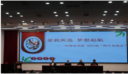 2021年10月28日下午18:30,外国语学院在老图书馆报告厅召开了2021级新生“师生见面会”。参加此次师生见面会的有外国语学院院长于兴亭、党委书记管志强、副院长沈刚、副院长王纯磊、2021级全体教师、辅导员以及2021级全体新同学。