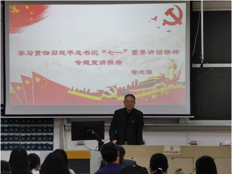 10月22日下午,外国语学院党委在1号教学楼第四阶梯教室面向全院党员和教职工举办了深入学习“七一”重要讲话精神专题党课,院党委书记管志强同志主讲。管志强同志宣讲了习近平总书记在庆祝中国共产党成立100周年大会上的重要讲话的主要内容、重要观点、基本精神及重大理论与实践问题,并引导全院党员和教职工继续在学懂弄通做实上下功夫。