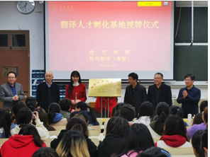 2021年3月24日下午,外国语学院在四阶隆重举行翻译人才孵化基地签约暨揭牌仪式。出席此次活动的有外交部前高翻李靖琳、南京策马翻译集团副总经理陈园娇女士、教务处吴绍兵处长、外国语学院全体院领导、系主任、教师代表和英语专业学生。