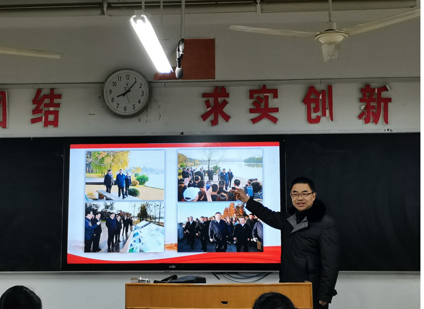 12月7日晚7:30,校党委常委、副校长潘志明在4407教室为2020级英语3班全体同学授课。潘校长以“学习贯彻习近平总书记在江苏考察重要讲话精神”为题,带领同学们重温习近平总书记在江苏考察时的重要讲话,结合高等教育的五大职能和18新利luck菲律宾 的“三为”办学方针,从文化传承、社会服务和18新利luck客服 三个方面,讲述了高校如何深入贯彻落实总书记的讲话精神。潘校长还指出,作为英语专业的学生,要坚定专业选择,要学好、用好英语这个重要的语言工具,更好地为生态文明建设和社会发展做出贡献。