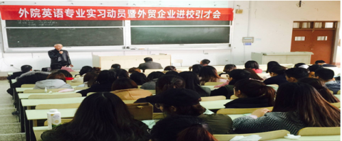 3月15日下午14:30,外国语学院外语专业实习动员暨外贸企业进校引才会如期举行。外国语学院侯小刚院长、管志强书记、于兴亭副院长,英语教研室丁爱群主任以及实习指导教师参加会议。会上,于兴亭副院长、丁爱群主任分别就英语(师范)、英语(商贸)专业的实习手册填写、实习过程中注意事项以及实习总结作了详尽的讲解与部署。于院长要求参加实习的同学们能够在各自实习岗位上踏实工作、储备经验,树当代大学生良好形象,展现宿院风采,并提醒同学们在实习期间要与指导教师保持联系,汇报实习情况,做到真正沉得下、做得好、有收获!最后,侯小刚院长结合他毕业时的实习经历与同学们分享了实习时光的宝贵与过程中所获所感,并强调这是同学们迈出职涯的第一步,也是关键一步。