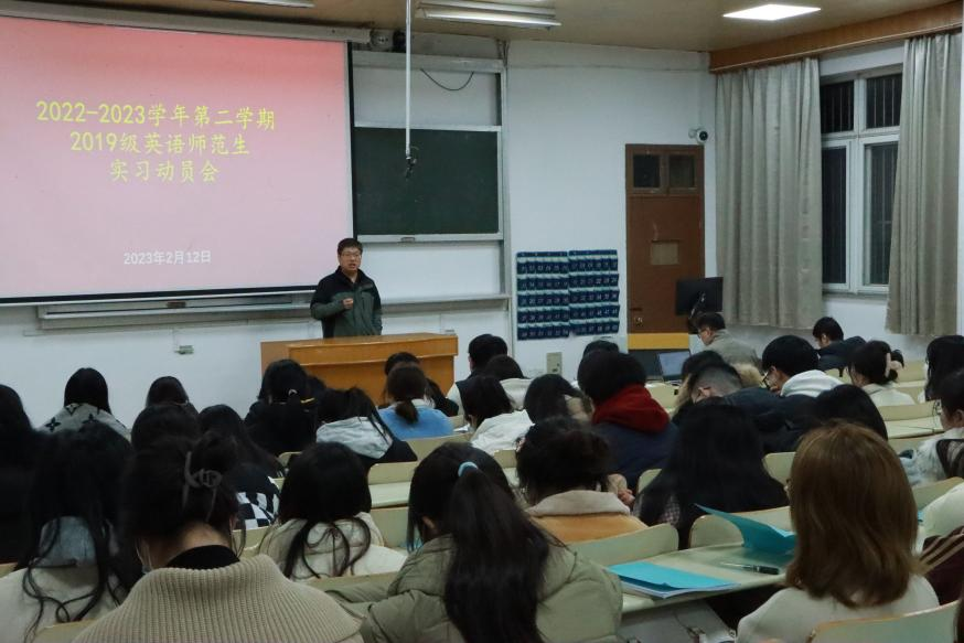 为提高2019级英语师范专业学生自身职业素养和职业技能,明确教育实习的目标与方向,提高教育实习工作的质量和效果,外国语学院英语教育系于2023年2月12日在三阶召开了2019级英语师范专业学生实习动员大会。副院长沈刚老师、英语系主任刘彬老师、实习指导老师及辅导员李战成老师参加了会议。