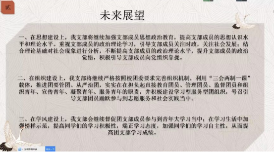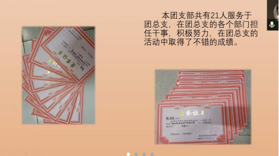 在本次评比活动中,各班团支书都展示了自己精心制作的评选内容,并且向评委解释了这些内容。评比内容由各班的团支部介绍、团支部思想建设、团支部组织建设、团支部学风学习、团支部获奖活动等部分组成。此次活动共有十个班级按顺序依次宣讲,每次宣讲结束都由评委进行打分。评比采取十分制,评比结束后,评分排在前三名的将会被评选为校级红旗团支部。