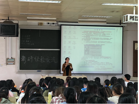 首先,王菲和张鸣骏两位同学分别向大家讲述了自己的考研之路,她们通过自己成功考研的经历,给大家以很大的鼓励。紧接着,高英健同学为大家详细讲解了扬州大学考研的一些经验,鼓励大家要坚定自己的目标,每天都要坚持练翻译,同时也指出,考研是一个很好的经历,对以后的考编或者走上社会工作都很有帮助。然后,高原同学也鼓励大家不要觉得考研很难,选择目标院校的的时候要慎重,他说自己平时在班里也不是学霸,只是确定了要考研之后,花了不少心思在复习考研科目上,在平时的时候,也可以多与辅导员或者老师多沟通交流来解决自己的困惑。接着,蒋雪阳同学已成功被扬州大学录取,她的考研准备不同于前几位同学的长时间攻克战,她说自己是在9月才决定要考研的,做了决定后,她开始静下心来准备复习。复习期间,不断的对所学知识复习巩固,尽量少玩手机。蒋雪阳同学也给大家分享了自己报考江师大的复试经验以及扬州大学考研经验。最后,来自14商英2班的钱海霞同学和大家分享的是自己的调剂经历,然后向同学们讲述了政治和其他考试科目的学习,最后希望大家对于考研,一定要坚持,不能放弃!