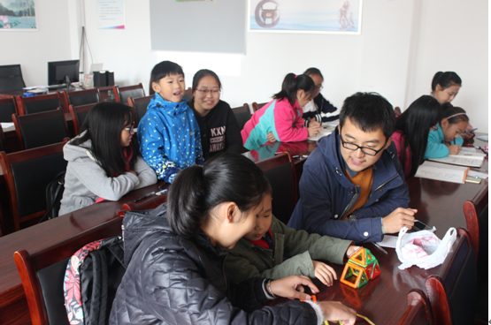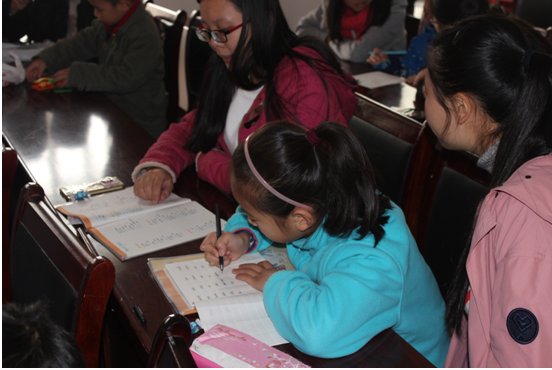 骤然下降的气温也阻挡不了志愿者们坚持活动,他们用自己的爱心给孩子们带来了深秋的温暖。面对初来乍到的志愿者,孩子们起初有些陌生,眼神中流露着害羞与懵懂,但很快又能打成一片。有些孩子年纪还小,刚上幼儿园,志愿者就用游戏的方式一边指着身边的物件一边教着他们一些单词,像是“yellow”、“blue”等等;而在面对大一点的孩子时,又可以带着他们温习功课----一周以来老师教授的内容,或是默一些单词,进行简单的对话。最后,大家又聚在一起观看电影,小朋友们看得聚精会神,“大朋友们”似乎也找回了自己的童年,沉浸其中。一个下午的时间过得飞快,很快又到了说再见的时间,志愿者们和孩子们依依不舍地告别,相约下周再见。