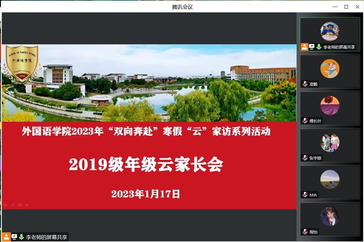 为深入贯彻落实党的二十大精神,进一步落实立德树人根本任务,凝聚家校合力,提升育人成效,外国语学院积极响应相关工作安排,把家访作为“必修课”,于1月13日至18日“点线面”三结合,开展2023年“双向奔赴”寒假“云”家访系列活动。学院副院长(主持)王纯磊、学院党委副书记王倩、全体辅导员、教务秘书、班主任及任课教师代表与家长共聚云端,进行“面对面”交流,共话成长,共育未来。