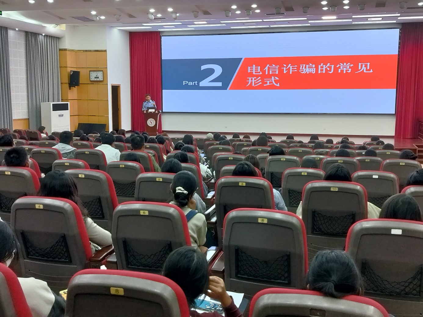 王警官向同学们介绍了什么是电信网络诈骗及生活中常见的电信网络诈骗骗局,如冒充公检法、社保、医保、银行、电信等机构工作人员,要求配合调查;冒充网店客服,谎称办理退款;高薪招聘兼职,骗取垫资、押金和入职费;以销售廉价飞机票、火车票及违禁物品为诱饵实施诈骗;虚构重金求子、婚恋等诈骗;冒充熟人、老师、同学进行诈骗;利用廉价物品,骗取包裹货到付款费等,并通过生动真实的案例,让同学们对于诈骗的形式和常用手段有了更加充分地了解。此外,王警官还对目前社会中出现的新型诈骗案例进行了详细的介绍,并普及了一系列防范电信诈骗的相关知识。