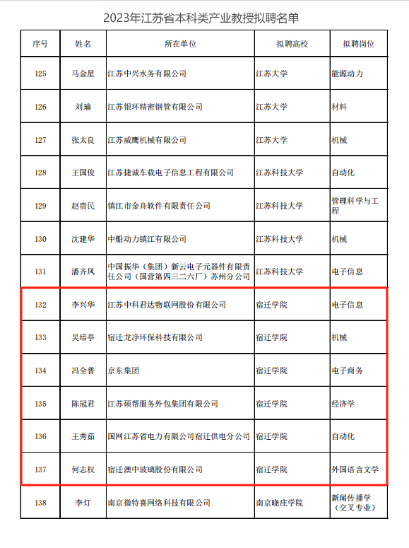 根据省委人才办、省教育厅、省科技厅、省人力资源社会保障厅《关于开展2023年江苏省产业教授(兼职)选聘工作的通知》,经过岗位发布、个人申报、高校推荐、资格审核、专家评审等环节,我校推荐的李兴华、吴培亭、冯全普、陈冠君、王秀茹、何志权等6人获批为江苏省本科类产业教授。