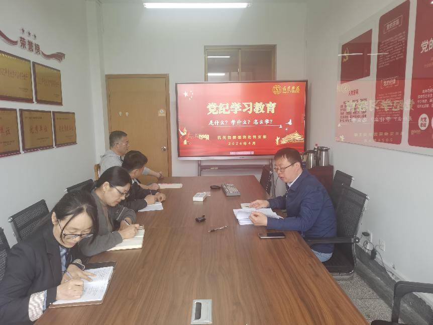 4月28日上午,国资处党支部在行政楼414会议室召开会议,主题是“党纪学习教育,是什么?学什么?怎么学”,支部全体党员、国资处全体人员参加会议,石鲁生副处长主持会议。