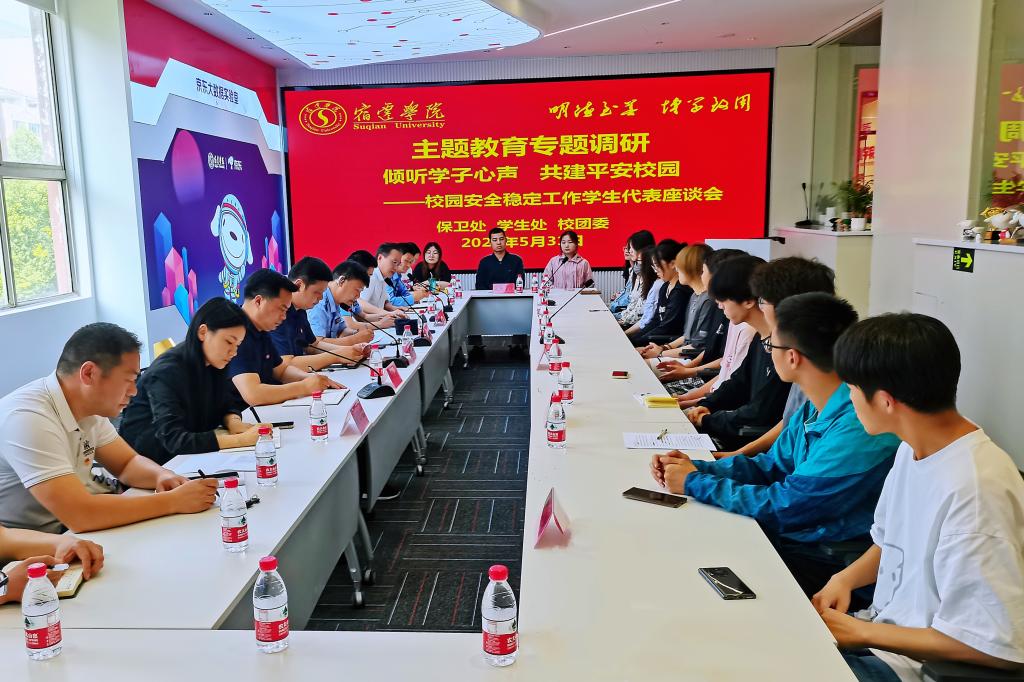 为深入开展学习贯彻习近平新时代中国特色社会主义思想主题教育,倾听在校学生对校园安全稳定工作的意见和建议,5月31日,保卫处组织开展主题教育专题调研,联合学工处、校团委召开“倾听学子心声·共建平安校园”安全稳定工作学生代表座谈会。保卫处全体人员、警务专员,学工处、校团委、辖区派出所有关负责同志,各二级学院学生代表等30余人参加会议。会议由保卫处负责人丁坤主持。